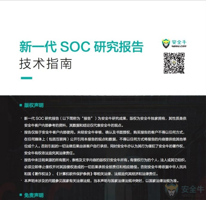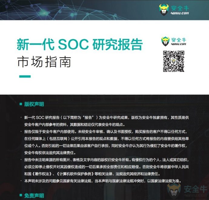 安全牛继威胁情报(现“威胁智能分析”)、工控安全之后,对应全景图“安全管理”大类下“SOC/ISOC”子领域,今日发布“新一代SOC研究报告”之市场指南及技术指南。
