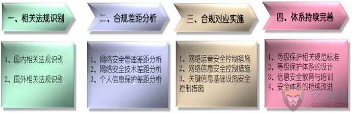 * 以上关键信息关键基础设施的范围参考了网信办2017年7月发布的《关键信息基础设施安全保护条例(征求意见稿)》 2) 个人信息 个人信息是指以电子或其他方式记录的能够单独或与其他信息结合识别自然人身份的各种信息,包括与确定自然人相关的生物特征、位置、行为等信息,如姓名、出生日期、身份证号、个人账号信息、住址、电话号码、指纹、虹膜等。 *以上个人信息的定义参考了全国信息安全标准化技术委员会2016年12月发布的《个人信息安全规范(征求意见稿)》 3.3 保护方法 《网络安全法》中涉及的保护方法主要有以下几种: 1) 实施等级保护 《网络安全法》第二十一条规定“网络运营者应当按照网络安全等级保护制度的要求,履行下列安全保护义务,保障网络免受干扰、破坏或者未经授权的访问,防止网络数据泄露或者被窃取、篡改”。 2) 网络运行安全和关键信息基础设施保护 在确保网络运行安全方面,要制定安全制度,落实安全职责,部署安全技术措施,防范网络攻击(第21条);确保网络产品和服务的安全性和合规性(第22条);网络关键设备和网络安全专用产品的安全认证和安全检测(第23条);建立网络安全事件处置流程,及时启动应急预案(第25条);关键信息基础设施的网络安全与信息化应做到“三同步”(第33条);设立信息安全专门机构和负责人,定期培训考核,系统与数据容灾备份,应急预案并定期演练(第39条);采购安全产品与服务要接受主管部门的安全审查(第35条);要与安全产品与服务方签订保密协议(第36条);重要数据和个人信息跨境传输(第37条);至少每年进行一次安全评估,并向主管部门上报评估结果;主管部门对关键信息基础设施进行抽查检测与评估(第38、39条)。 3) 个人信息保护 在个人信息保护方面,组织应制定敏感信息保护制度(第21(4)、37、40、45、47、48、50条);网络运营者收集、使用个人信息时,要向用户明示并取得同意,不得超范围滥用个人信息(第22、41、44、45条);网络运营者应当采取技术措施和其他必要措施,确保其收集的个人信息安全(第42条);个人有权要求网络运营者删除和更改其个人信息(第43条);网络运营者要对其内部及外部用户使用网络行为进行监督(第46、47、48条);网络运营者应当建立网络信息安全投诉、举报制度,配合主管部门的调查与处置(第49、50条)。 4) 网络安全检测与预警 为保障网络安全,《网络安全法》第二十一条还规定,“网络运营者应当采取监测、记录网络运行状态、网络安全事件的技术措施,并按照规定留存相关的网络日志不少于六个月”, 第五十二条规定,“负责关键信息基础设施安全保护工作的部门,应当建立健全本行业、本领域的网络安全监测预警和信息通报制度,并按照规定报送网络安全监测预警信息。”;第五十一条规定,国家层面上“国家网信部门应当统筹协调有关部门加强网络安全信息收集、分析和通报工作,按照规定统一发布网络安全监测预警信息。” 5) 网络安全应急管理 《网络安全法》第二十五条规定,“普通网络运营者应当制定网络安全事件应急预案,及时处置系统漏洞、计算机病毒、网络攻击、网络侵入等安全风险;在发生危害网络安全的事件时,立即启动应急预案,采取相应的补救措施,并按照规定向有关主管部门报告。“;第三十四条规定,“关键信息基础设施的运营者除制定网络安全事件应急预案外还应定期进行演练”。对于行业监管者而言,第五十三条规定,“负责关键信息基础设施安全保护工作的部门应当制定本行业、本领域的网络安全事件应急预案,并定期组织演练”。国家层面,第三十九条规定,“网信部门定期组织关键信息基础设施的运营者进行网络安全应急演练,提高应对网络安全事件的水平和协同配合能力”。 6) 网络安全技术人才培养和安全意识宣传 《网络安全法》第三十四条规定,关键信息基础设施的运营者还应当定期对从业人员进行网络安全教育、技术培训和技能考核; 第十九条则要求各级人民政府、有关部门应组织开展经常性的网络安全宣传教育,并指导、督促有关单位做好网络安全宣传教育工作,大众媒体应有针对性地面向社会进行网络安全宣传教育。 7) 职责落实与违规处罚 为确保《网络安全法》顺利实施,执行有力,该法第六章“法律责任”对所涉及责任主体的违法惩处进行了详细规定。 二、《网络安全法》实施 为有效地推进《网络安全法》的实施,总体可分为相关法规识别、合规差距分析、合规对应实施和体系持续完善四个步骤。本部分详细描述前三个步骤,第三部分“信息安全体系完善”描述第四个步骤。 1. 相关法规识别 《网络安全法》第八条规定:“国务院电信主管部门、公安部门和其他有关机关依照本法和有关法律、行政法规的规定,在各自职责范围内负责网络安全保护和监督管理工作。”因此,各网络运营者在实施《网络安全法》时,不仅要深入了解《网络安全法》的要求,还需要参考其他配套的法规及标准,以确保《网络安全法》的安全控制措施能有效落实。 近年来,主管部门及安全标准化机构发布了多个与《网络安全法》实施相关的法规与标准,有的还处在征求意见当中。为方便各类机构在实施《网络安全法》时加以参考,把最重要的相关法规与标准列表如下: 国内近期发布《网络安全法》相关法规标准