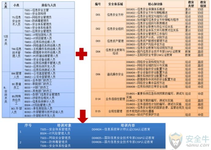 等级保护对象由原来的信息系统,调整为:安全等级保护的对象包括网络基础设施、信息系统、大数据、云计算平台、物联网、工控系统等。 等级保护相关的定级指南、测评指南、设计技术要求、测评要求、测评过程指南等相关标准也发布了相应的修订版(征求意见稿)。 2. 等级保护体系的设计 等级保护的设计分为安全策略设计、安全管理设计及安全技术设计三个方面的内容,形成信息安全保障体系的组织体系、策略体系、技术体系及运行体系。 2.1 总体安全策略设计 总体策略设计的目标是形成组织纲领性的安全策略文件,包括确定安全方针和安全策略两方面的内容。安全方针是阐明安全工作的使命和意愿,定义信息安全的总体目标,规定信息安全责任机构和职责,建立安全工作运行模式等;安全策略是说明安全工作的主要策略,包括安全组织机构划分策略、业务系统分级策略、数据信息分级策略、等级保护对象互连策略、信息流控制策略等。 通过方针与策略的设计,以便组织可以结合等级保护基本要求系列标准、行业基本要求和安全保护特殊要求,构建机构等级保护对象的安全技术体系结构和安全管理体系结构。对于新建的等级保护对象,应在立项时明确其安全保护等级,并按照相应的保护等级要求进行总体安全策略设计。 2.2 安全管理体系设计 根据等级保护基本要求系列标准、行业基本要求、安全需求分析报告等,设计等级保护对象安全管理体系框架。主要是从安全管理制度、安全管理机构、人员安全管理、系统建设管理、系统运维管理五个方面进行设计。 安全管理体系设计成果可分为四层。第一层为总体方针、安全策略,通过信息安全总体方针、安全策略明确机构信息安全工作的总体目标、范围、原则等。第二层为信息安全管理制度,通过对信息安全活动中的各类内容建立管理制度,约束信息安全相关行为。第三层为安全技术标准、操作规程,通过对管理人员或操作人员执行的日常管理行为建立操作规程,规范信息安全管理制度的具体技术实现细节。第四层为记录、表单,用于在信息安全管理制度、操作规程实施时需填写的表单和需保留的操作记录。 2.3 安全技术体系设计 根据组织总体安全策略文件、GB/T 22239、行业基本要求和安全需求,设计等级保护对象的安全技术体系架构。等级保护对象的安全技术防护体系由从外到内的“纵深防御”体系构成,首先通过“物理环境安全防护”保护服务器、网络设备以及其他设备设施免遭地震、火灾、水灾、盗窃等事故导致的破坏,然后通过“通信网络安全防护”保护暴露于外部的通信线路和通信设备,通过“网络边界安全防护”对等级保护对象实施边界安全防护,内部不同级别定级对象尽量分别部署在相应保护等级的内部安全区域,低级别定级对象部署在高等级安全区域时遵循“就高保护”原则,对于内部安全区域将实施“主机设备安全防护”和“应用和数据安全防护”,通过“安全管理中心”对整个等级保护对象实施统一的安全技术管理。 等级保护对象的安全技术体系架构见下图所示: 根据安全技术架构的设计,组织可以寻找相应的技术与产品来实施安全控制措施。安全技术与产品的选择,请参考安全调查分析机构安全牛推出的 “网络安全行业全景图”(http://all.aqniu.com/)。 网络安全全景图目前共分为17大安全领域,59个细分领域,包含约200家安全企业和相关机构,比较全面地对主流的安全技术与产品进行了介绍,可以供用户在选择技术与产品解决方案时加以参考。 3. 信息安全教育与培训 《网络安全法》第三十四条规定,关键信息基础设施的运营者还应当履行对从业人员进行网络安全教育、技术培训和技能考核的义务。 信息安全教育与培训是实施有效信息管理的重要基础,组织要周期性地进行信息安全教育与培训规划,要在员工中形成一个行之有效、常抓不懈的氛围,教育的形式既要生动有趣,又要紧凑有效。组织可以考虑采用以下NIST基于角色与职责的、框架式的安全教育模型: 组织可根据各岗位人员信息安全能力建设需求,设计未来3到5年信息安全培训规划,并针对各岗位的工作特征,制定各岗位信息安全能力需求表,以及由知识组合成的课程。根据组织的实际情况可采用以下基于角色与职责的、框架式的课程设计。以下是基于岗位与信息安全知识体对应的培训方案示例: 此外,《网络安全法》第十九条规定,“各级人民政府及其有关部门应当组织开展经常性的网络安全宣传教育,并指导、督促有关单位做好网络安全宣传教育工作。“因此,网络运营者在进行人员能力建设的同时,还应加强包括管理层在内全员网络安全意识培养和重要性宣传的工作。 普通员工是各项业务的执行者,员工信息安全意识的薄弱是组织信息安全最大的风险。内部员工无意的疏忽,往往会引发敏感信息泄露等安全事件的发生。内部员工的信息安全意识水平提升有助于减少信息安全风险,提升组织的总体信息安全水平。 组织应设计与提供贯穿员工整个职业生命周期的、多种层次、多种方式的信息安全意识宣贯,提高组织全体员工的信息安全意识水平。以下是各类信息安全意识教育形式示例: 4. 安全体系的持续改进 组织在经过合规差距分析并建成组织、管理和技术体系之后,要推进体系的运行。如果条件许可