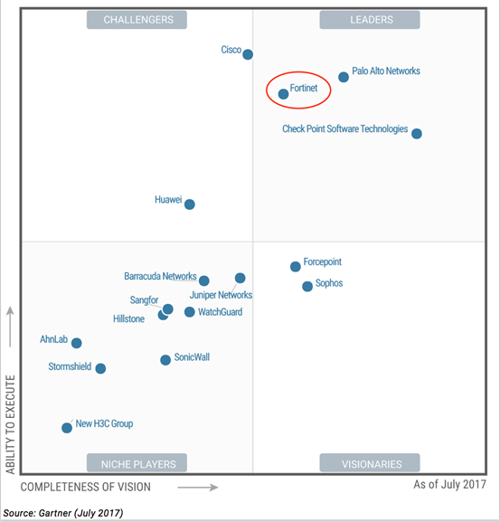 近日,Gartner 发布了2017年企业防火墙魔力象限(Magic Quadrant)报告,Fortinet成功跃入领导者象限。Gartner认为其在市场执行、营销策略、客户体验、功能与性能以及市场覆盖等方面具有突出的表现,并能够在云端与本地提供一体化的能力与可见性。这一结果与评价充分印证了Fortinet旗舰企业防火墙产品FortiGate在业界无可置疑的领先地位,同时也在很大程度上展现了Fortinet成为安全市场佼佼者的“源力”。
