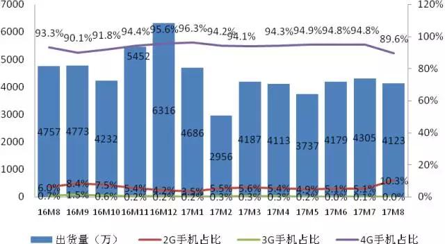 2017年8月,4G手机出货量3695.6万部,上市新机型66款,同比分别下降16.7%和37.7%,占比分别为89.6%和73.3%。1-8月,4G手机出货量3.04亿部,上市新机型561款,同比分别下降6.7%和36.0%,占比分别为94.2%和80.1%。