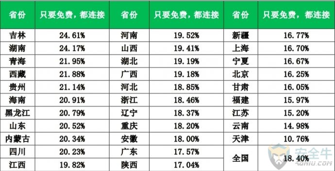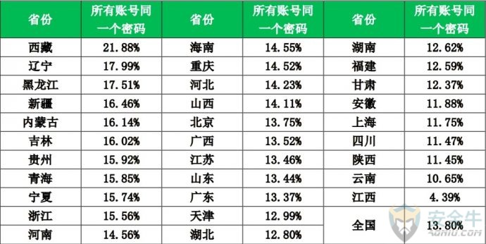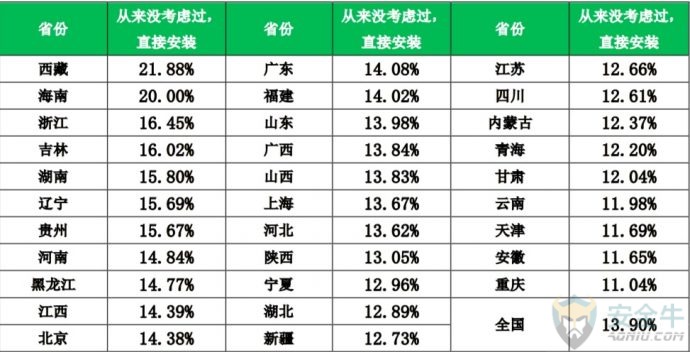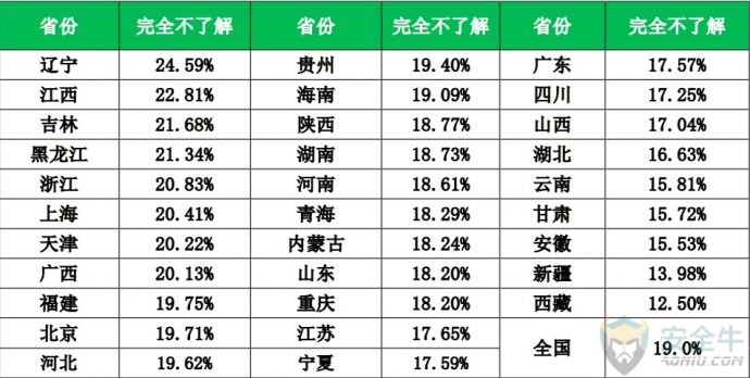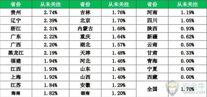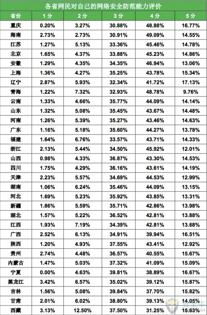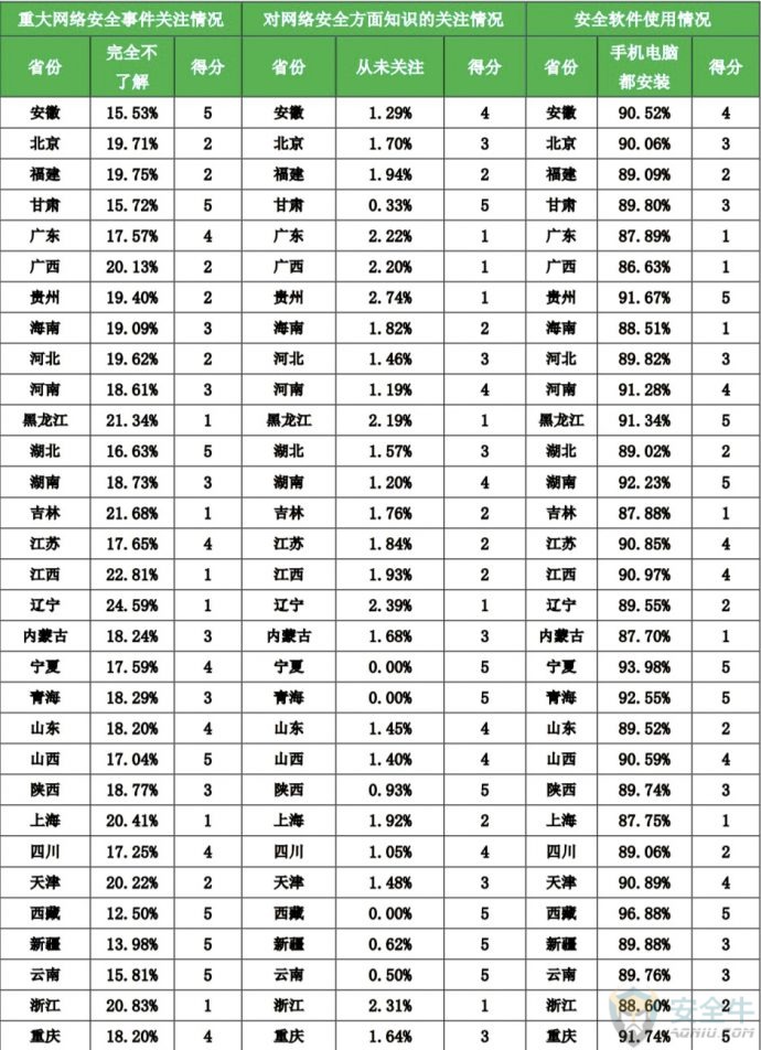 信息来源:安全牛 一、网民上网的安全感 安全感是一种复杂的心理因素,与个人经历、周边环境、知识水平都有关系。为了能更加全面的了解全国网民上网过程中的整体安全感,我们选择了网络环境的安全感、信息渠道的可信度和防范能力自我评价这三个角度,展开调研与分析。 1. 网络环境的安全感 对于自身所处的网络环境,中国网民的安全感还是相对比较高的,约九成的网民认为当前的网络环境是安全的。其中,6.9%的网民认为非常安全;49.1%的网民认为当前的网络环境比较安全;32.8%的网民认为一般安全。与之相反的是,2.0%的网民认为非常危险;9.2%的网民认为当前的网络环境比较危险。 2. 信息渠道的可信度 网络信息纷繁复杂,欺诈、谣言时有发生。那么,普通网民对于什么样的信息发布者,什么样的信息发布渠道更加信任呢?本次调研也对这个问题展开了研究。我们请网民对信息发布者和信息发布渠道的信任度进行打分,1-5分,1分最不可信,5分为最可信。 下表给出了网民对信息发布者可信度打分的结果。从平均分来看,网民最信任的信息发布者是:媒体发布,平均得分为3.8,其次是自媒体、行业专家、资深人士,得分是3.1。 信息发布者可靠性分析 从信息发布的渠道来看,网民最信任广播/电视发布的网络信息,信任度平均分为4.0,最不信任论坛/博客发布的网络安全信息,信任度平均分为2.6。 信息发布渠道的可靠性分析 3. 防范能力自我评价 此项调研是让网民对自己的网络安全防范能力进行打分。结果显示,网民对自己网络安全防范能力总体来说是比较自信的,43.7%的网民给自己打了4分,14.4%的网民给自己打了5分。 不过,从大量网络诈骗的实际案例来看,对于新型网络骗术,越是自信的人,往往越容易上当受骗。 从各省网民对自己的网络安全防范能力评价来看,重庆、海南、江苏、北京、安徽五省市的网民最自信,超过60%的网民给自己的评分在4分以上。 各省网民对自己的网络安全防范能力评价 二、安全知识的关注与学习 一个普通网民能够在多大的程度上主动关注网络安全事件,并自主学习网络安全知识,是这个网民的网络安全意识的重要体现。本次调研也对这一问题进行了研究。 1. 重大网安事件的关注 从网民对永恒之蓝、Petya勒索病毒等重大网络安全事件看法来看,其中,40.4%的网民会持续关注,担心自己受到攻击,想了解防御方法;26.7%的网民会关注相关内容,但也感觉不太会影响到自己生活,13.9%的网民看过报道,但不怎么关心,感觉和自己关系不大。特别值得注意的是,19.0%的网民完全不了解、不知道近期发生的这些重大的网络安全事件。实际上,这类人群往往更容易受到网络侵害,属于高危人群。 从各省情况来看,辽宁、江西、吉林、黑龙江、浙江5省网民对重大网络安全事件完全不了解的人群占比最高。 各省网民对重大网络安全事件的关注情况 2. 网络安全知识的学习 不过,尽管有19.0%的网民完全不了解近期发生的重大网络安全事件,但对于安全知识,网民还是比较关注的。统计显示,29.7%的网民一直关注网络安全方面的知识;36.4%的网民一直关注;32.2%的网民偶尔关注;仅有1.7%的网民对网络安全方面的知识从未关注过。 从各省情况来看,贵州、辽宁、浙江、广东、广西5省网民对网络安全方面的知识从未关注的人群占比最高。 各省网民对网络安全方面知识的关注情况 网络安全知识,除了自己学习以外,还有很多政企机构会组织集体学习,但这种有组织的学习非常少见。统计显示,82.6%的网民都没有接受过任何形式的网络安全培训,网络安全知识主要靠自学;13.0%的网民只接受过很少的专门培训;仅4.4%的网民接受过很多的专门培训。 那么,网民是从哪些具体的途径学习到的网络安全知识呢?统计显示:在接触或学习过网络安全知识的网民中,82.2%的人是从电视、网络等新闻中接受的网络安全知识;34.2%的人是听朋友、同事给讲过;32.1%的是听过相关的讲座。 三、上网安全意识与习惯 良好的安全意识与上网习惯,是安全上网的基本保证。本次调研分别从安全软件使用习惯,帐号密码设置习惯、公共WiFi连接习惯和常用软件下载渠道这四个方面展开研究。 1. 安全软件使用习惯 统计显示,89.5%的网民在手机和电脑上都安装了安全软件;9.1%的网民仅电脑安装了安全软件;0.7%的网民仅在手机上安装了安全软件;仅有0.7%的网民手机、电脑都没有安装安全软件。 从各省情况来看,浙江、吉林、辽宁、上海、广西5省市网民手机电脑均安装安全软件情况相对较差。 各省网民安全软件使用情况 安装了安全软件,还要正确的使用安全软件。其中使用安全软件对电脑和手机进行日常检查,就是很重要的环节。统计显示,在网民中,57.9%的人每天都会使用安全软件检查电脑或手机;23.5%的人每2-3天检查一次;11.2%的人每周检查一次。总体来看,网民有很好的安全软件使用习惯。 2. 账号密码设置习惯 弱密码问题,多账号共用密码的问题,一直是长期存在的网络安全顽疾。不过,多数网民还是能够有较好的密码管理习惯。 统计显示,24.1%的网民每个账号密码都不同;61.4%的网民会把账号密码做一定的区分;但仍有13.8%的网民将所有账号都使用同一个密码,十分危险。 从各省情况来看,西藏、辽宁、黑龙江、新疆、内蒙古5省网民在上网时使用同一个账号密码的用户比例最高,存在一定的安全隐患。 各省网
