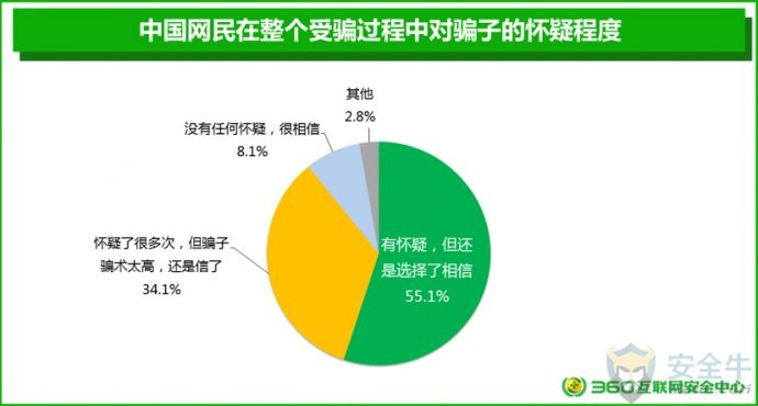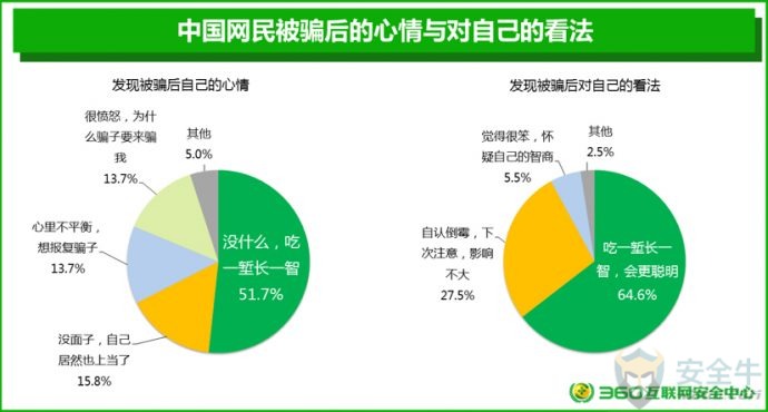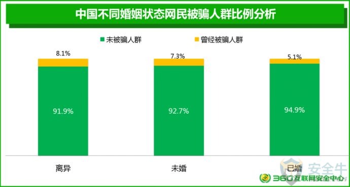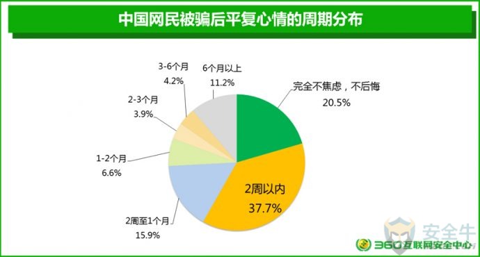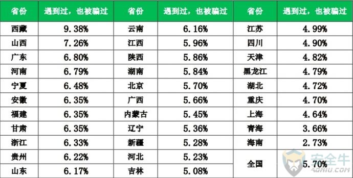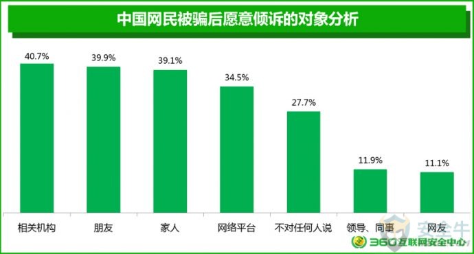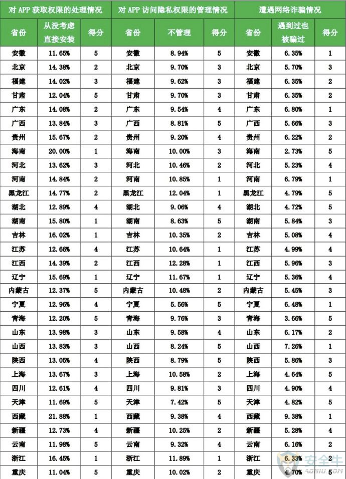 1) 尽量选择知名应用商店,或正规网站、官方认证的网站进行下载; 手机APP在安装过程中会提示用户获取权限。某些APP会超出功能范围获取手机权限,木马病毒更是会要求获取很多敏感权限。用户应当养成认真检查APP获取权限的良好习惯。统计显示,在网民中,40.4%的人表示会看一看,再安装;19.6%的人认为看了也没用,直接安装;只有25.5%的人表示会仔细看,如果遇到担心的问题,会不安装软件。 从各省情况来看,西藏、海南、浙江、吉林、湖南5省网民在安装软件时从未考虑过app权限问题而直接安装的用户比例最高,安全意识相对薄弱。 各省网民对APP获取权限的处理情况 手机APP在安装之后,仍然可以进行权限管理。特别是APP对用户手机上的某些隐私信息,如短信、通信录、照片等的隐私访问权限,有必要进行有效的管理。在被问及如何管理手机APP的隐私访问权限时,48.4%的网民表示用手机安全软件管理;41.2%的网民会自己进行手动管理;10%的网民完全不管理。 从各省情况来看,江西、黑龙江、浙江、辽宁、河南5省网民不管理手机访问隐私权限的用户比例最高,安全意识相对薄弱。 各省网民对APP访问隐私权限的管理情况 四、网络诈骗防范意识 1. 网络诈骗的基本情况 网络诈骗犯罪活动日益猖獗,调查显示,72.6%的网民都曾经遭遇过网络诈骗,约5.7%的网民曾经被骗子成功诈骗。另有21.7%的网民从未遭遇过任何形式的网络诈骗。不过,需要说明的是,正所谓“吃一堑长一智”,从未遭遇过网络诈骗的人反而可能是最容易被骗的人。 从各省情况来看,西藏、山西、广东、河南、宁夏5省网民网络诈骗受害者比例最高。 各省遭遇网络诈骗受害者情况 在对曾经被骗子成功诈骗的受害者进行的调研中,我们发现:在整个被骗过程中对骗子完全没有任何一点怀疑的人其实只占8.1%,而55.1%人都会或多或少的有一点怀疑,还有34.1%的人表示,虽然自己也怀疑了很多次,但骗子骗术实在太高,最后自己还是信了。 2. 被骗后不报警的原因 当发现自己被骗后,受害者应当在第一时间进行报警。但调研显示,只有61.8%的网民受害者在被骗后会选择报警,另38.2%的网民选择不报警。 对网民被骗后不报警的原因进行进一步调研分析后发现,在不报警的受害者中,36.3%的网民感觉警察也帮不来自己;25.1%的网民觉得钱少,就算了;21.3%的上海网民觉得自己没有证据,无法报警,且有7.1%的网民不好意思报警。 五、网络诈骗心理影响 网络诈骗不仅是一次性伤害,还会对以后的工作和生活产生很大影响。在本次调研中,我们特别对网络诈骗活动受害者的心理和生活影响等方面的问题展开了研究。 1. 如何看待自己被骗 在被问及自己被骗后是怎样的心情时,我们发现:51.7%的受害者都能比较想得开,认为吃一堑长一智,没有什么;15.8%的人会觉得自己很没面子;13.7%的受害者会有心里不平衡;还有13.7%的受害者会感到非常愤怒。 而在被问及被骗后如何看待自己这个问题时,64.6%的网民受害者都会比较积极的认为自己被骗后会变得更聪明;27.5%的受害者则是自认倒霉,但觉得对自己影响不大;不过,也有5.5%人会觉得自己很笨,怀疑自己的智商。 2. 被骗后的倾诉对象 一般情况下,对于遭遇到网络诈骗的人来说,向他人倾诉可以适度减轻受害者本人的紧张和懊恼情绪。但很多受害者也往往担忧他人会嘲笑自己或不能理解自己,因此选择了沉默或是向陌生人倾诉。 在本次调研中,我们也特别对受害者愿意倾诉的对象进行了调研。研究显示:网络诈骗受害者首选的倾诉对象是有关机构(公安、银行、第三方支付机构等),占比40.7%,其次是朋友39.9%、家人39.1%、网络平台34.5%、领导或同事11.9%、网友11.1%。另有27.7%的受害者表示,他们不会向任何人诉说自己的被骗经历。 其中39.1%的受害者会愿意向家人倾诉。但这也意味着,60.9%的受害者可能永远也不会把自己被骗的经历告诉自己的家人。这是一个非常值得我们深刻思考的问题:你的家人也许就曾经被骗,只是您并不知道。 3. 被骗后的平复周期 网络诈骗到底会对一个受害者的心理产生多长时间的影响?研究显示,网民在遭遇网络诈骗后,平均需要38天来平复心情。其中,20.5%的人完全不被影响心情,瞬间平复;37.7%的人可以在2周以内平复心情;15.9%的人需要2周至1个月的时间来平复自己的心情。 但是特别的,还有11.2%的人在被骗后需要用6个月,甚至6个月以上的时间来平复自己的心情,甚至有个别受害者表示,会留下一辈子的心理阴影,由此可见,对于部分网络诈骗受害者来说,适度的心理辅导还是很有必要的。 六、影响防骗能力的个体因素 人的个体特征因素是否会对防骗能力有一定的影响?在本次研究中,我们对参与调研的上海网民的性别、年龄、婚姻状况等因素也进行了分析,并由此得到了一些新的结论。 1. 防骗能力的性别差异 在本次接受调研的上海网民中,约有5.6%的男性和7.1%的女性曾经被骗。这在一定程度上反映出,在网民中女性比男性更容易被骗。 2. 防骗能力的年龄差异 在本次接受调研的网民中,90后是相对来说是最容易被骗的群体,90后的网络诈骗受害者占90后总数的8.4%;80后的网络诈骗受害者占80后总数的6.5%;而70后是网络诈骗受害者占比最少的群人,70后的网络诈骗受害者占70后总数的4.9%。 从具体的年龄段来看,在本次接受调研的网民中,20-29岁的网民最容易被骗,曾经被骗的受害者占到该年龄