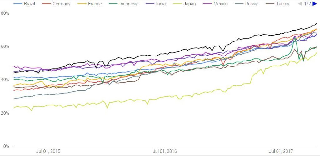 根据地理位置的分析显示,美国(从59%升至73%),日本(从31%升至55%)和巴西(从50%升至66%),均有显着改善。