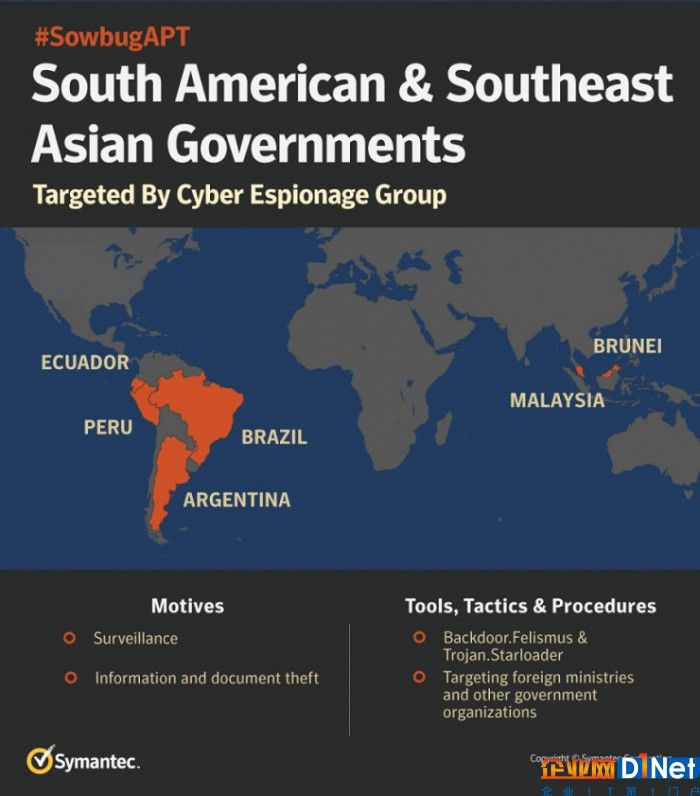赛门铁克最近发现了一个此前不为人所知的网络间谍组织——名叫“Sowbug(潮虫)”。该组织一直在对南美和东南亚企业进行高度针对性的网络攻击,其中涉及到一些外交政策政府部门和外交组织机构。据赛门铁克公司最近发布的一份分析报告显示,“潮虫”网络间谍组织会采取一些间谍攻击活动,来窃取政府部门文件。
