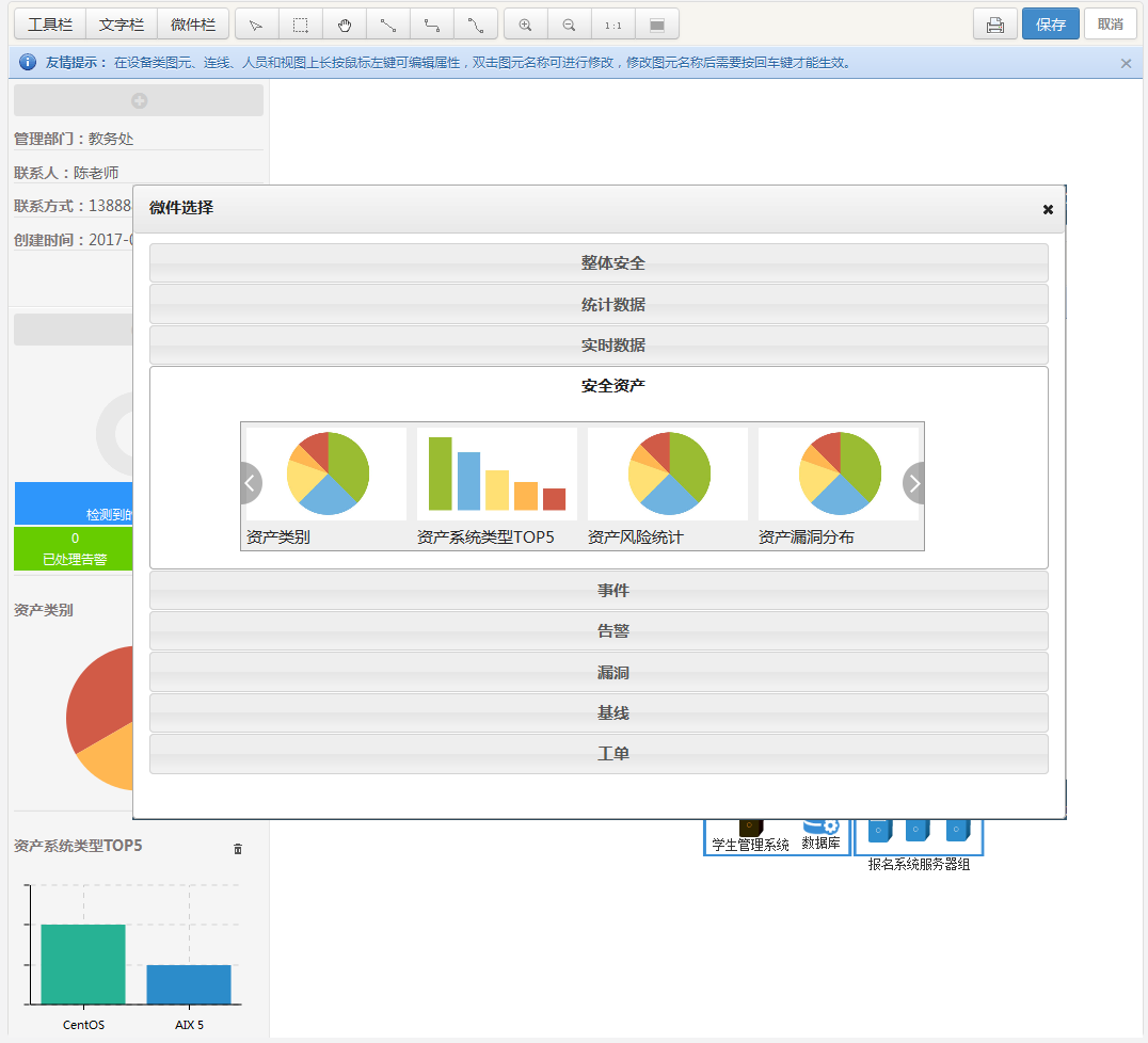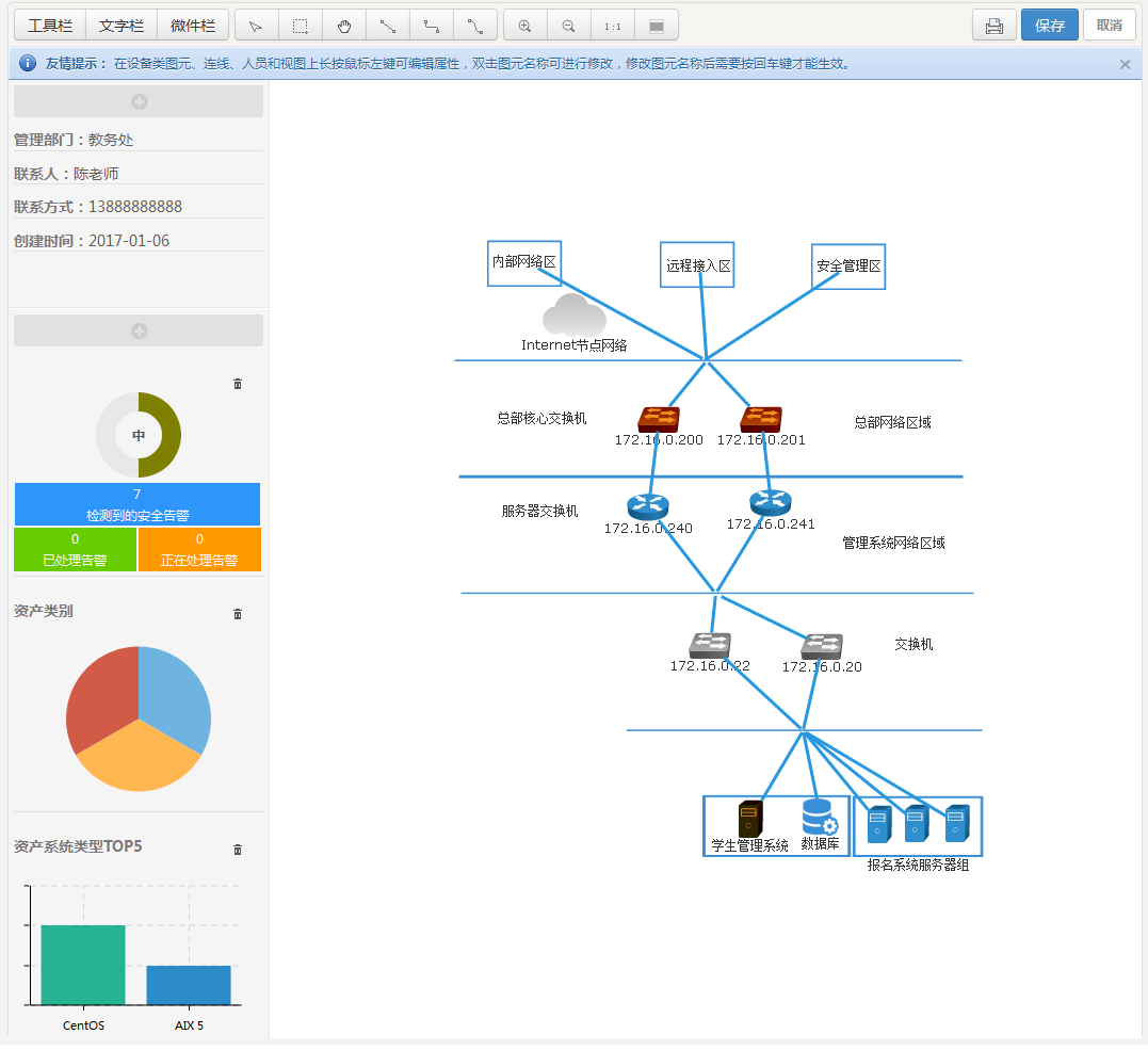 拓扑管理中,用户可根据需要在左侧添加文字信息和微件信息,添加后效果如下图所示: