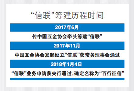 事实上,百行征信即为市场上俗称的“信联”。成立“信联”一事,已传了半年之久。2017年6月,北京商报记者从知情人士处获悉,市场化个人征信机构,即“信联”主要由互金协会牵头在做,该联合机构将效仿第三方支付“共建、共有、共享”原则的“网联”模式,在传统金融之外,实现对互联网金融和小微金融个人征信的全面覆盖。在2017年11月24日互金协会获准通过参与发起设立个人征信机构的事项。