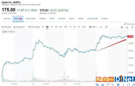 不过次日苹果股价并未下挫,而是明显走高。本周五苹果股价盘中升破175美元,日内涨逾1%,回到一周多以前水平。一周多以前,台湾媒体传出苹果将今年一季度iPhone预期销量大减四成的消息,引发苹果股价下挫,此后苹果就未曾回到175美元上方。