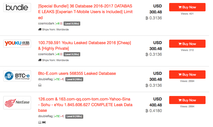 游戏行业在地上互联网公司也是盈利最为可观的,在地下自然也聚集了大量相关从业人员,拥有众多的细分变现产业链。能否直接获得游戏账号的撞库方案自然是受黑客欢迎与关注的,因此,游戏公司向来是撞库攻击的高发地。国内外各大游戏公司在2017年都持续受到大量的撞库攻击。 版权行业和社交行业也是深受其害,随着正版化的推进以及带宽的增加,许多相关资源需要付费观看,存在不愿意花高价购买会员,而愿意用低价购买一个账号使用的人,就会存在这些会员账号变现的途径,进而这些账号也就是对黑产有价值的。 社交行业也拥有数量众多的变现方式,主要的灰产有刷量(点赞、播放量、榜单等)、私信引流、色情社交引流、诈骗等。社交平台对抗的风控策略不断升级,社交平台的老账号也就成了某些圈内富有价值的资源,如某陌交友平台的老号价格在30元以上。老号资源意味着封杀率低、生意可持续。因此,社交账号也是黑产的重要目标。 撞库数据来源 (1)信封号产业链 信封号,是QQ号产业链中的黑话,每一万个或者一千个被盗取的QQ号,称为一个信封。信封号产业链就是QQ号盗取、销赃的产业链。当QQ号中的Q币、游戏虚拟装备等被清洗一空、压榨干净后。就会将大量的账号密码贩卖给黑客完善社工库,或者制作密码字典。由于QQ邮箱在国内的市场占有率很高,以及很多用户习惯直接用QQ号对应的QQ邮箱和密码作为第三方平台的账号。大量QQ号被直接用来进行网站撞库。 (2)网站泄露数据库 网站泄露数据库的标志性事件是2011年CSDN 600万用户数据泄露,引领了当年一波数据泄露高峰,数十个网站的用户数据被公开,大量只在地下流通的数据被抛上台面。平时不关注此道的黑客也掌握了足够的数据源切入,某种程度上点燃了撞库攻击的热潮。而且被爆出的数据泄露其实也只是冰山一角,更多的再地下黑市中交易流通。 (3)地下黑市流通 数据窃取与交易是地下产业链隐藏最深的部分,也常有一些定制性的交易,不少黑客通过数据交易来构建庞大的社工库。黑客间的私下交易,我们无法得知,到底有多少网站数据已经被窃取也无法客观的评估。但通过半公开渠道也可管中窥豹,以下是暗网某地下数据交易市场的截图: