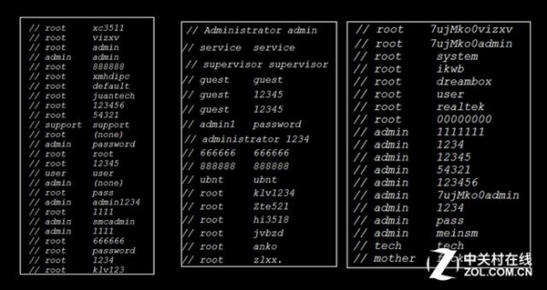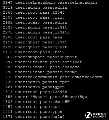 通常新的用户名和密码列表代表了新的攻击目标。研究人员发现这些用户名和密码,很可能是安装电信宽带时,赠送的家庭路由器所使用的默认设置。