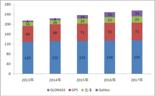 数据来源:CNNIC (二)北斗系统建设应用取得重大进展 统筹推进北斗建设应用工作机制进一步健全。军地有关部门共同研究制定推进北斗系统建设应用的政策举措,稳步推进北斗系统建设发展应用,以应用促进北斗新发展。核心技术自主创新能力显著增强。北斗三号在星载原子钟、大功率放大器、通道开关等重要元器件的核心技术上取得突破,研制出天稳定度达到10-14量级的星载原子钟。北斗产业化加快发展。已形成由芯片模块、应用终端、运行服务构成的完整产业链。北斗与互联网、云计算、大数据融合,建成高精度时空信息云服务平台,推出全球首个支持北斗的加速辅助定位系统,服务覆盖200余个国家和地区,用户突破1亿,日服务达2亿次。国家北斗精准服务网已经进入全国400多座城市,广泛应用在城市燃气、城镇供热、电力电网、供水排水、智能交通、智能养老等领域。加快拓展国际市场。北斗产品已经开始面向“一带一路”沿线及周边国家提供服务,如巴基斯坦的交通运输、港口管理,缅甸的土地规划、河运监管,老挝的精细农业、病虫灾害监管,印尼的海上集成应用等。北斗三号系统建设加速推进,2017年11月,2018年1月、2月,连续3次以“一箭双星”发射六颗组网卫星,开启了北斗卫星导航系统全球组网新征程。 图9 2013-2017年全球四大卫星导航系统累计发射卫星数