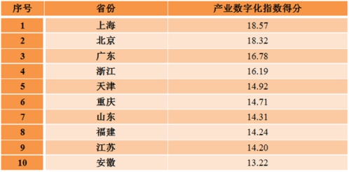 (四)产业数字化转型持续加快 上海、北京、广东、浙江、天津、重庆、山东、福建、江苏、安徽等10个地方位列各省(区、市)产业数字化指数排名前十位。上述地区积极推动信息技术在制造业、农业、服务业深度应用,全面推进信息化和工业化深度融合,推动电子商务提档升级,创新产业生产模式和组织方式,带动产业资源灵活高效配置,产业数字化转型的创新活力和核心竞争力明显提升。 表6 各省(区、市)产业数字化指数排名前10位
