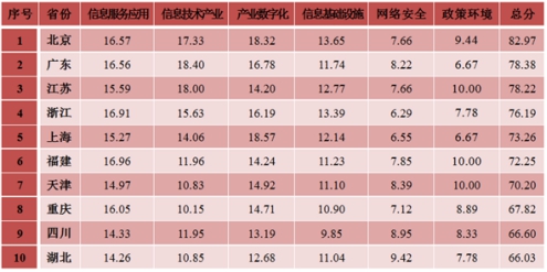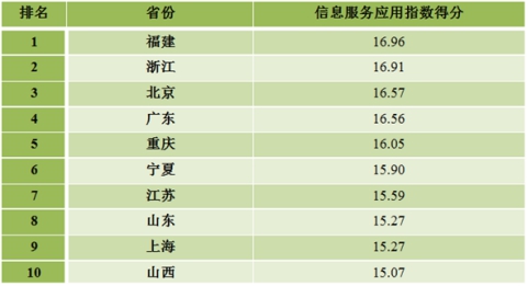 主要成效和亮点如下:北京加快建设国际一流信息化之都,全面推进大数据、物联网、云计算等新一代信息技术在民生服务、城市治理、产业升级等重点领域的深度融合应用,强化人工智能技术研发与产业应用。广东大力发展智能制造、工业互联网,推进新一代信息技术与传统产业深度融合发展,拓展制造业发展新空间,推进产业集群发展,助推实体经济行稳致远。积极探索建设“数字政府”。江苏加快建设网络强省、数据强省、智造强省,高水平建设智慧江苏,积极打造物联网技术创新先导区、产业集聚区和应用示范先行区,大力推进互联网、大数据、人工智能与实体经济融合发展,信息化与工业化融合水平全国第一。浙江全面推进“最多跑一次”改革,大力推进“1253”公共数据共享技术体系建设,建设专用平台实现“一网通办”,持续优化营商环境。全力打造国家信息经济示范区。上海全面推进面向未来的新型智慧城市建设,城市治理和公共服务的泛在化、融合化、智敏化水平显著提升,信息惠民便民效果日益显现。推动数字经济与实体经济深度融合,促进产业高端发展,不断健全网络安全保障体系。福建坚持“数字福建”一张蓝图绘到底,建设集应急防灾、网上行政审批、行政执法、便民服务为一体的公共信息管理平台,推动龙头企业和产业园区研发创新,不断拓展信息技术产业链的聚集倍增效应,数字福建建设取得明显成效。天津全面推进智能制造,发展大规模个性化定制,打造双创平台,加快构建融合创新的数字经济体系。积极推动全市高速移动安全泛在的新一代信息基础设施建设。重庆大力推进公共信息资源整合与应用,深入实施网络扶贫行动,公共服务领域信息化水平明显提升。加快构建现代信息技术与产业体系,产业数字化能力不断增强。四川聚力核心技术超越工程,加快信息安全、云计算与大数据、光通信与移动互联网、北斗卫星导航等相关产业聚集,推进关键技术突破,做大做强核心产业。湖北加强信息基础设施集约化建设,加快推进“宽带湖北”建设,加快推动网络安全产业、电子信息产业和软件服务业发展,数字产业化水平明显提升,网络信息安全保障逐步加强。 (二)信息服务应用惠及全民 福建、浙江、北京、广东、重庆、宁夏、江苏、山东、上海、山西等10个地方位列各省(区、市)信息服务应用指数排名前十位。上述地区高度重视信息技术对公共服务效能的提升作用,推动互联网广泛普及,全面开展“互联网+政务服务”,让信息多跑路,群众少跑腿。积极推动教育、医疗健康、社会保障、文化等信息服务城乡覆盖,信息惠民便民深入发展,群众满意度明显提升。 表4 各省(区、市) 信息服务应用指数排名前10位