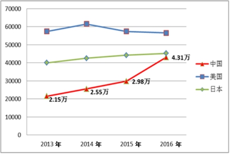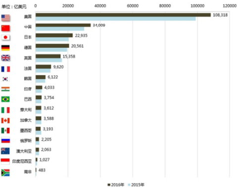 数据来源:中国信息通信研究院 (四)数字经济蓬勃发展 当前,世界经济加速向以网络信息技术产业为重要内容的经济活动转变。适应把握引领经济发展新常态,国务院出台《关于进一步扩大和升级信息消费持续释放内需潜力的指导意见》、《关于积极推进“互联网+”行动的指导意见》、《中国制造2025》。国家有关部门共同研究制定《数字经济发展战略纲要》,制定实施《关于促进分享经济发展的指导性意见》,大力促进数字经济、分享经济健康发展。加快实施电子商务、“互联网+先进制造业”、“互联网+现代农业”、“互联网+便捷交通”等专项行动,推动数字经济与实体经济融合发展。 数字产业化方面,新技术、新产业、新业态、新模式不断涌现。2017年我国数字经济规模达27.2万亿元,同比增长20.3%,占GDP的比重达到32.9%,成为驱动经济转型升级的重要动力引擎。电子信息制造业、软件和信息服务业、通信业持续快速发展,2017年信息产业收入规模达22.1万亿元,同比增长14.5%。智能电视产量9666万台,增长3.8%。工业机器人产量13万台(套),增长81.0%。民用无人机产量290万架,增长67.0%。软件业务收入5.5万亿元,同比增长13.9%。2017年,我国信息消费规模提升至4.5万亿元,同比增长15.4%,为同期最终消费增速的2倍左右,占最终消费的比重达10%,对GDP增长贡献超过0.4个百分点。移动支付逐步实现全场景消费,移动支付交易规模超过200万亿元,居全球第一。我国网信企业的整体实力和全球竞争能力不断提升,7家互联网企业市值跻身全球20强。 产业数字化方面,信息化成为推动经济发展质量变革、效率变革、动力变革,提高全要素生产率的重要动力引擎。深入实施《关于深化制造业与互联网融合发展的指导意见》、《关于深化“互联网+先进制造业”发展工业互联网的指导意见》,推动制造业与互联网深度融合发展,软件定义、数据驱动、平台支撑、服务增值、智能主导的特征日趋明显。两化融合发展水平从2016年的50.7提高到2017年的51.8,规模以上工业企业数字化研发设计工具普及率达到63.3%,关键工序数控化率达到46.4%。工业互联网快速发展,形成了一批面向高铁、风电等复杂产品的新型工业APP并初步实现商业化应用。智能制造工程深入实施,开展428个智能制造项目,创新驱动不断增强,在全国分两批建设了120个“双创”示范基地,制造业骨干企业“双创”平台普及率达到70%,网络化协同制造、个性化定制、服务型制造等新模式新业态持续涌现。农业农村信息化步伐明显加快,全面实施信息进村入户工程,在10省市开展信息进村入户整省推进示范,全国共建成运行益农信息社16.9万个,开展便民服务2.33亿人次。打造一批数字农业示范样板,不断提高农业生产智能化、经营网络化、服务在线化水平。《电子商务“十三五”发展规划》落地实施,电子商务实现提档升级。2017年我国网络零售额达71751亿,同比增长32.2%,跨境电子商务同比增长超过30%。农村电商发展势头迅猛,全国农村实现网络零售额1.24万亿,同比增长39.1%。2017年共享经济市场交易额约4.9万亿元,比上年增长47.2%。加快推进“互联网+便捷交通”,发展智能交通,便捷旅客出行。建设完善国家交通运输物流公共信息平台,推动物流信息共享,促进物流降本增效。2017年全国快递业务量累计完成400.6亿件,增长28%,规模连续4年稳居世界第一。 图4 2015-2016年G20数字经济规模