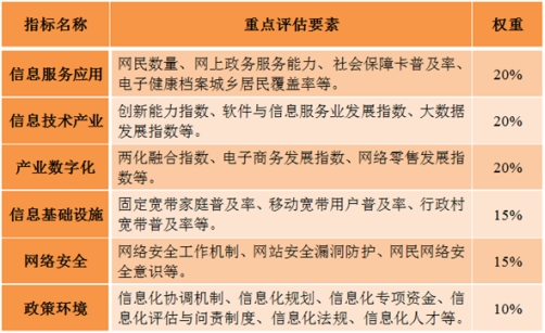 数据来源:国家卫生健康委员会 四、各地区信息化发展加快推进 为更好地评估各地区落实《国家信息化发展战略纲要》和《“十三五”国家信息化规划》的进展情况,国家互联网信息办公室组织有关单位,结合国家统计局、工业和信息化部、CNNIC等部门和机构的统计数据和指数,设计了我国信息化发展评价指标体系,主要包括信息服务应用、信息技术产业、产业数字化、信息基础设施、网络安全、政策环境等6个方面的指标,形成信息化发展评价指数。指数数值越高,表明地区信息化发展成效越好。 表2 信息化发展评价指标体系