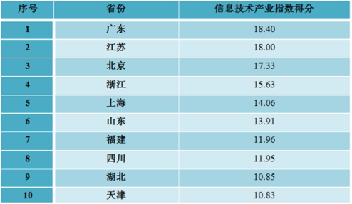 (三)信息技术产业快速发展 广东、江苏、北京、浙江、上海、山东、福建、四川、湖北、天津等10个地方位列各省(区、市)信息技术产业指数排名前十位。上述地区高度重视信息技术产业发展和生态体系建设,出台促进信息技术产业发展的相关规划和行动计划,强化信息技术创新带动作用,围绕产业链布局创新链,以创新链提升价值链,加快发展新一代信息技术产业,培育壮大电子制造业、软件与信息技术服务产业,推动大数据广泛应用于经济社会发展各领域,产业创新发展和辐射带动作用明显增强。 表5 各省(区、市)信息技术产业指数排名前10位