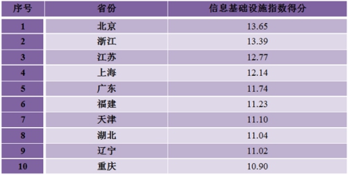 (五)信息基础设施能力全面提升 北京、浙江、江苏、上海、广东、福建、天津、湖北、辽宁、重庆等10个地方位列各省(区、市)信息基础设施指数排名前十位。上述地区大力推进城乡固定宽带网络建设普及,加快实施“光进铜退”改造,扩大4G移动通信网络覆盖,深入推进网络提速降费,全面落实电信普遍服务工作,区域信息基础设施支撑能力全面提升,数字红利有效释放。 表7 各省(区、市)信息基础设施指数排名前10位