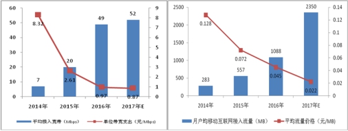 数据来源:国家工业信息安全发展研究中心 (二)信息基础设施全面提升 信息基础设施是经济社会发展的“大动脉”,互联网成为人们学习、工作、生活的新空间,成为人们获取公共服务的新平台。国家有关部门深入实施“宽带中国”战略,推动陆海空天一体化信息基础设施建设,统筹应用基础设施建设和频谱资源配置,实施国家新一代信息基础设施建设工程和乡村及偏远地区宽带提升工程,加快打造泛在先进的信息基础设施体系,基本建成全球性能最优、规模最大的现代信息基础设施。 高速宽带网络加快建设。2017年,互联网宽带接入端口数量达到7.79亿个,固定宽带家庭普及率达到72%。光网城市建设驶入快车道,光纤宽带接入用户29392万户,全国50Mbps以上宽带用户占总用户比例超过70%,部分区域已经开始提供千兆宽带服务。移动宽带用户总数达11.3亿户,移动互联网接入流量246亿GB,同比增长162.7%,4G用户规模超过10亿。全国广播节目综合人口覆盖率98.71%,有线电视实际用户2.2亿户,其中有线数字电视实际用户1.98亿户,有线数字高清用户超过8900万户,全国直播卫星用户1.29亿户。空天一体化进程提速。2017年4月,我国首颗高通量通信卫星实践十三号发射成功,并于2018年1月交付使用。在轨测试期间,成功进行了国际首次高轨卫星对地高速激光双向通信试验。我国在轨民(商)通信卫星达到18颗。五年来新增10个国家级骨干直联点城市,国内网间互联带宽年平均增长42%。国际光缆通达30多个国家和地区,网络国际出口带宽7320180Mbps。农村及偏远地区网络覆盖快速提升。电信普遍服务深入推进,2017年,完成3.2万个行政村通光纤的任务部署,全国行政村通光纤比例超过95%。网民中农村网民占比27%,规模达到2.09亿,农村互联网普及率上升至35.4%。贫困村宽带网络覆盖率超过90%,已提前完成“十三五”规划确定的目标。网络提速降费持续推进。2017年第三季度,全国固定宽带用户网络下载的忙闲时加权平均下载速率为16.4Mbit/s,同比增长48.7%。固定宽带单位带宽平均资费、移动流量平均资费较2016年分别下降15.37%和35.50%。全部取消手机国内长途和漫游费。 图2 2014-2017年我国固定宽带和移动数据提速降费情况