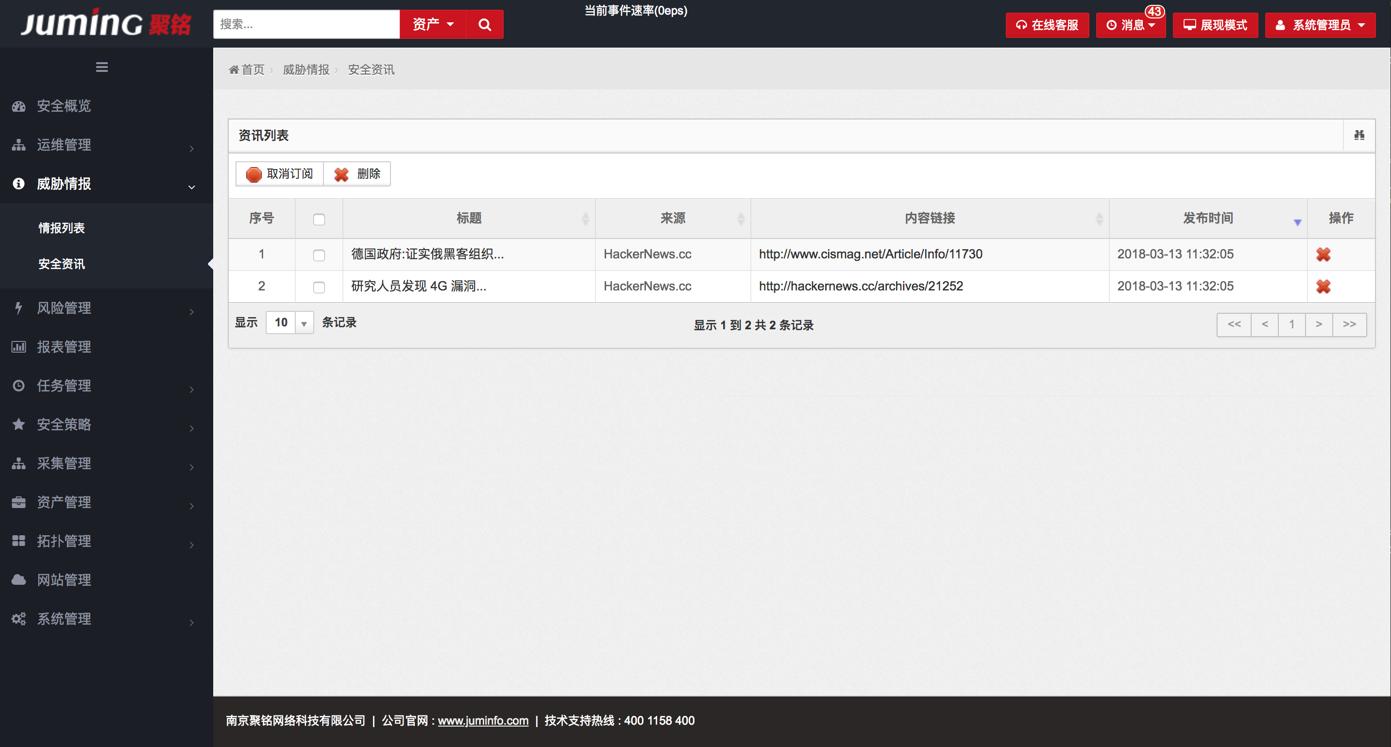 通过威胁情报的订阅,展示最新的实时威胁情报信息,可以为系统内资产以及行业内存在的潜在威胁提供一些有价值的情报信息来供使用者查看分析。