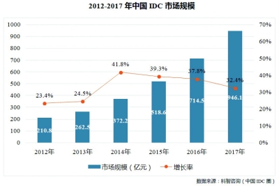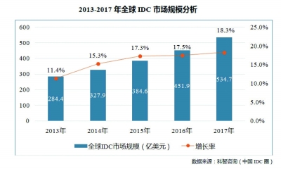 科智咨询(中国IDC圈研究中心)日前发布的最新报告显示,2017年中国IDC市场总规模为946.1亿元,同比增长32.4%(见图1)。2017年全球IDC市场在云计算业务的带动下继续保持较稳定增长,整体市场份额达到534.7亿美元,增速为18.3%(见图2)。
