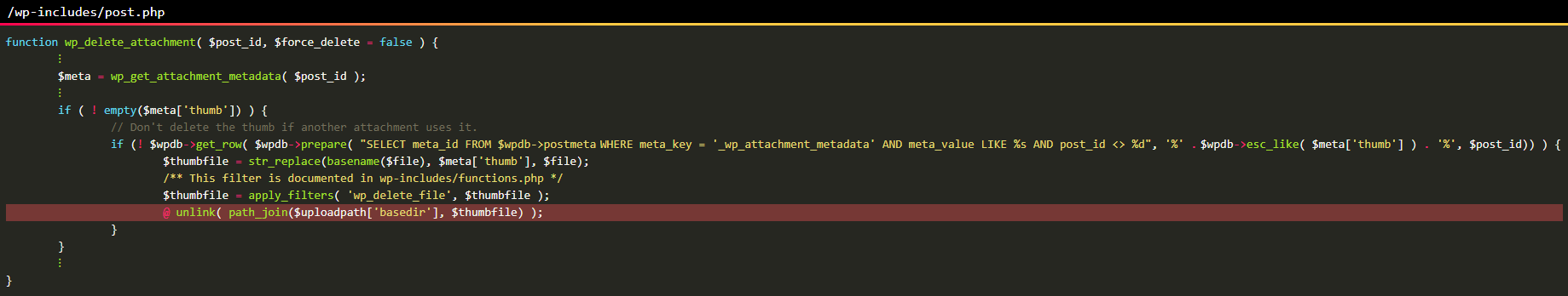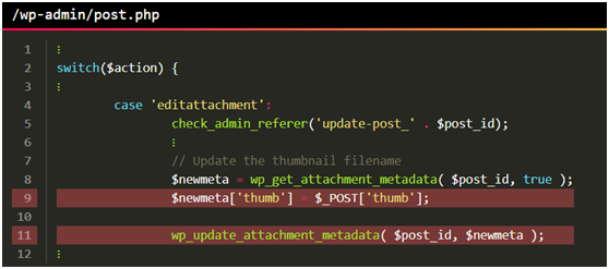 此代码片段/wp-admin/post.php代表了附件中属于附件的缩略图的文件名如何保存到数据库中。在从保存在$_POST[‘thumb’]数据库中的用户输入中检索和保存到数据库wp_update_attachment_metadata()之间没有任何安全措施,以确保该值代表正在编辑的附件的缩略图。$_POST[‘thumb’]对于任何文件的路径,这个值可以保存到WordPress上传目录的相对路径中,当附件被删除时,该文件将被删除,如第一列表中所示。