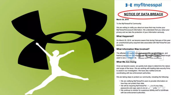 2018年3月下旬,美国功能性运动品牌 Under Armour (安德玛)1.5亿用户数据泄露,其为健身爱好者提供的手机应用 MyFitnessPal 于2018年2月遭遇大规模数据泄露事件,1.5亿用户账号受影响,自披露后 Under Armour 股价下跌了3.8%。