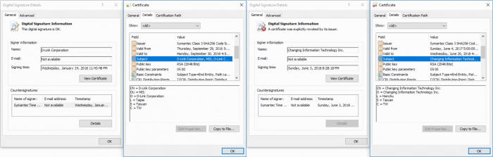 鲜为人知的网络间谍组织 BlackTech 被发现使用了友讯科技(D-Link)的证书签名其恶意程序。相同的证书被用于签名友讯的官方软件,因此安全研究人员认为 BlackTech 使用的证书很有可能是窃取的。发现失窃证书的安全研究员 Anton Cherepanov 称,证书被用于签名两个恶意负荷,第一个是 PLEAD 后门,第二个是密码窃取程序。