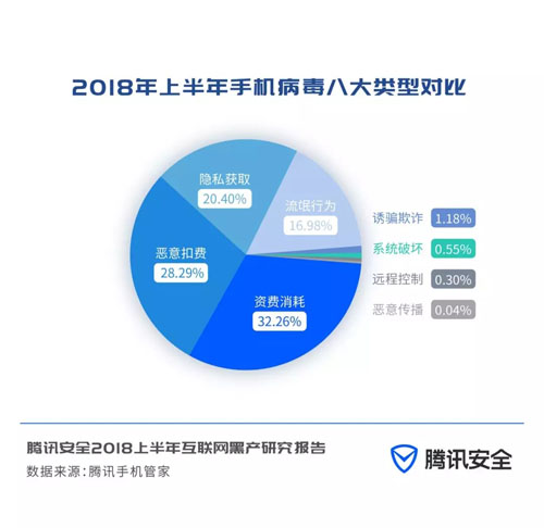 “这些互联网黑产,给用户和软件开发者带来了巨大损失。”腾讯手机管家统计的2018年上半年手机病毒八大类型对比中,资费消耗和恶意扣费合计占比60.55%,隐私获取占到20.4%,余下的还有流氓行为、诱骗欺诈、系统破坏等。