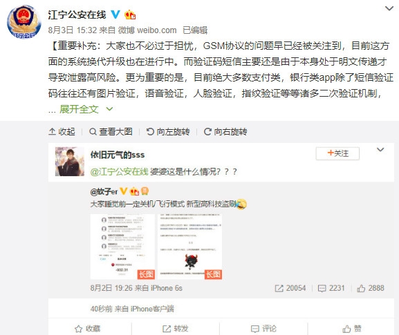 同时,江宁公安消息称,大家不必过于担忧,GSM协议的问题系统换代升级也在进行中。目前绝大多数支付类、银行类app除了短信验证码往往还有图片验证,语音验证,人脸验证,指纹验证等等诸多二次验证机制,如果单单泄露验证码,问题是不大的。绝大多数中招的用户是因为同时泄露了身份证号等其他重要身份信。“GSM劫持防不了,其他信息泄露还是可防的。”