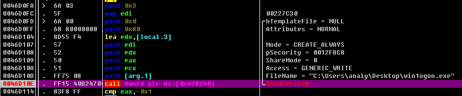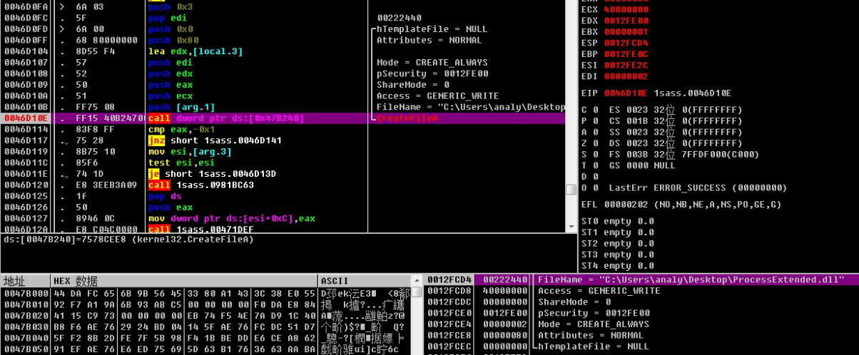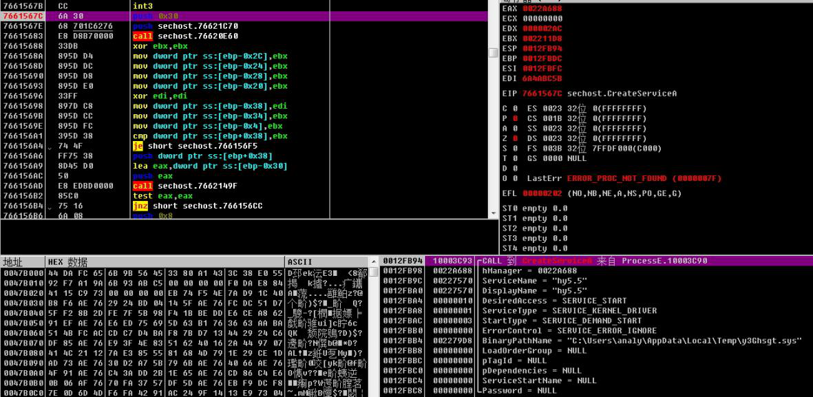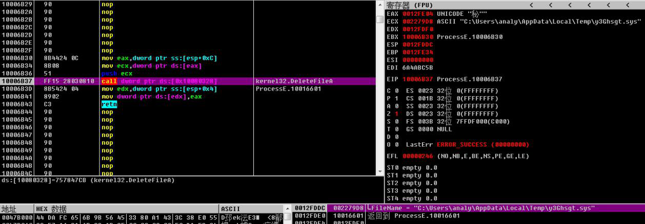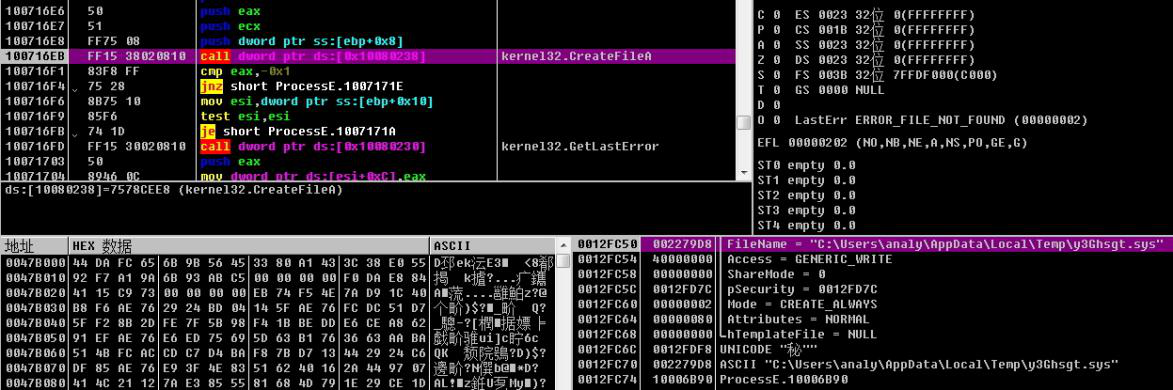 ProcessProtectionX函数首先释放一个驱动文件到%Temp%目录,驱动文件名由7个随机的字母加数字组成。