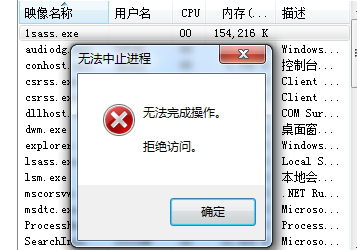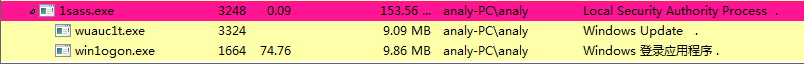 尝试终止1sass.exe进程,提示“拒绝访问”。而终止wuauc1t.exe和win1ogon.exe进程后,又会重新起来!这里,是因为有驱动保护了1sass.exe,而1sass.exe又防护了wuauc1t.exe与win1ogon.exe,环环相扣,多层护体。