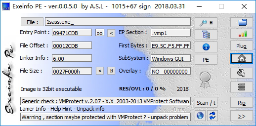 病毒母体1sass.exe为一个win32程序,加了VMP壳。
