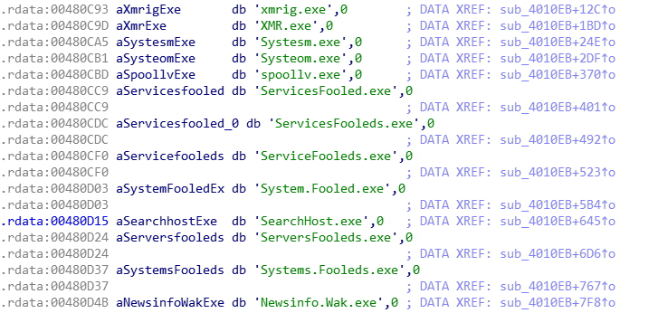 挖矿模块包含两个进程:wuauc1t.exe和win1ogon.exe。由1sass.exe释放并运行,随后进入循环对这两个进程进程守护。