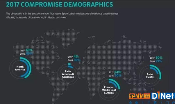 调查发现,约半数安全事件涉及企业与内部网络(较2016年43%的比例有所上升),其次为电子商务环境(30%)。影响销售点(即POS)系统的事件目前占比为20%,减少了至少三分之一。网络攻击复杂程度逐步提升,且目标逐步瞄准各大型服务供应商及特许经营部门; 相比之下,前几年最受青睐的批量攻击则有所减少。
