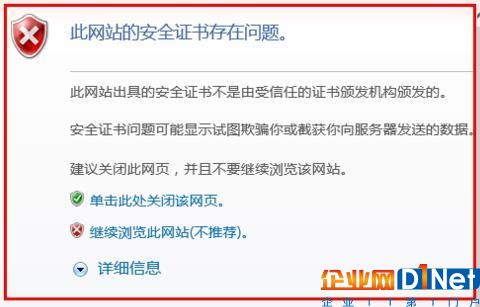 如果证书已经过了有效期,一样会显示警告信息:“此网站出具的安全证书已过期或还未生效。安全证书问题可能显示试图欺骗您或截获您向服务器发送的数据。建议关闭此网页,并且不要继续浏览该网站。”