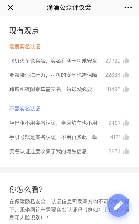 1月15日,滴滴出行公众号发布了第四期公众评议会,就“乘客坐网约车是否需要实名认证”的话题,邀请用户、社会各界参与投票,话题讨论持续七天。最终投票结果将通过滴滴出行公众号进行发布。