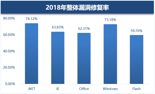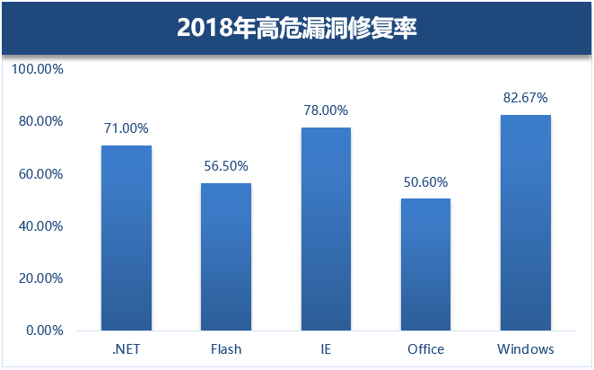 而在四类高危漏洞(存在野外利用的漏洞)修复中,Windows高危漏洞达到了82%的修复率,其次是IE和.NET高危漏洞修复率约达到70%,Flash和Office高危漏洞则修复率较低,仅有约50%。