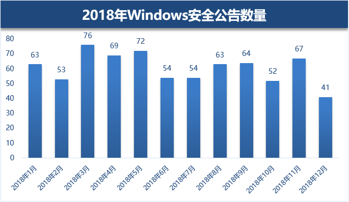 2.1 2018年Windows安全公告数量 在软硬件漏洞遍地都是的今天,补丁管理作为网络安全最基础的一环,就显得尤为重要。在企业选择产品时亦需要注意厂商对其产品安全性的投入,只有软件/平台开发商对于产品安全性投入高,产品才有保障。微软作为全球知名的软件开发商,对其名下产品的安全性投入是比较到位的,每月都会进行维护发布补丁修复安全漏洞。2018全年微软共为其产品(Windows,IE/Edge,office等)发布了874个补丁,修复了728个漏洞,平均每月修复多达60个漏洞。