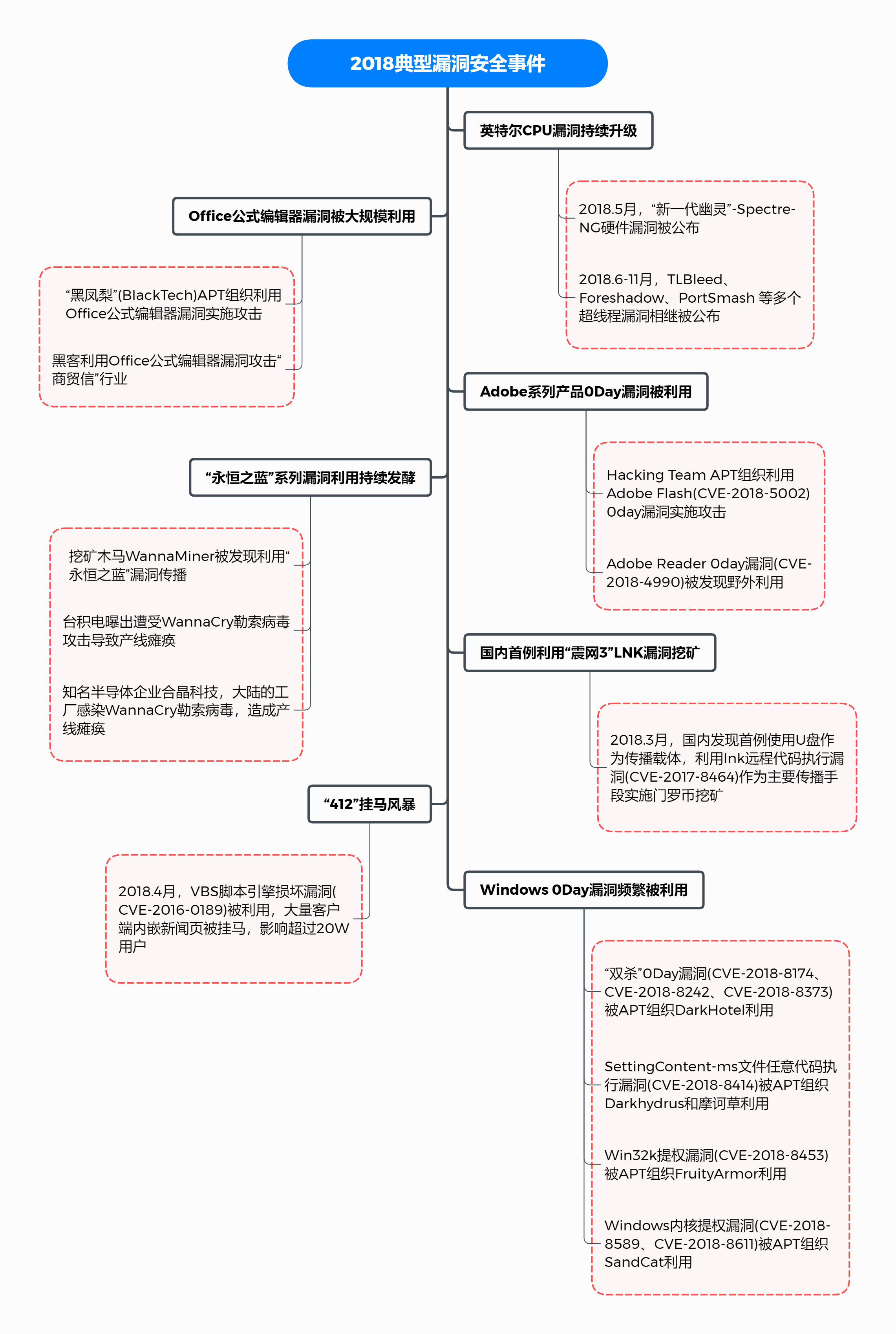 3.1 “新一代幽灵”——英特尔CPU漏洞持续升级 继年初发现的CPU漏洞Meltdown和Spectre后,英特尔处理器在2018年5月初又被Google Project Zero安全研究团队曝出发现8个新的“幽灵式”硬件漏洞,被称为“新一代幽灵”——Spectre-NG。利用该漏洞可绕过云主机系统与虚拟机的隔离,实现虚拟机逃逸,窃取机密信息。并且,利用该漏洞还可以攻击同一服务器的其它虚拟机。 然而,在下半年再次发现了英特尔CPU存在TLBleed、Foreshadow、PortSmash等多个超线程漏洞。11月初发现的PortSmash漏洞(CVE-2018-5407)影响所有支持超线程技术的Intel处理器。利用该漏洞,攻击者所在的进程可以窃取运行在同一个物理内核的另外一个进程的隐私数据,安全研究人员已经实现从OpenSSL进程中窃取私钥。 一系列的CPU漏洞,对芯片漏洞的修复同样一波三折,仓促发布的补丁带来新的风险,同时导致CPU性能下降,补丁不得不发行了多个版本,最终促使英特尔加快新一代处理器的发布进程,并成为把超线程技术彻底砍掉的最后一根稻草。 3.2 Office公式编辑器再曝新漏洞,商贸信钓鱼攻击屡试不爽 (CVE-2017-11882、CVE-2018-0802、CVE-2018-0798) Office公式编辑器漏洞(CVE-2017-11882)是典型的栈溢出漏洞,存在于Eqnedit.exe组件中,该漏洞影响所有Office版本且极易利用,由于该漏洞在2017年11月14日仅仅被Windows添加了ASLR(地址随机化)漏洞缓解措施,实际上并未真正修复,且大量用户并不升级Office补丁,因此至今仍能见到许多野外攻击案例。 2017年12月20日,腾讯御见威胁情报中心就发现Eqnedt32模块还存在其他漏洞,同时捕获了一例“黑凤梨”(BlackTech)APT组织利用Office公式编辑器中的0day漏洞(CVE-2018-0802)进行攻击的样本,该样本采用鱼叉攻击的方式将携带恶意代码的Office文档伪装成办公文件进行传播,影响范围较为广泛。 2018年1月9日,Office公式编辑器再曝出新漏洞,这次Windows干脆直接通过删掉公式编辑器的途径来修复漏洞,一了百了。但漏洞补丁刚发布一周,就已开始出现多例CVE-2018-0798漏洞的变种和在野利用。 2018年2月26日腾讯御见威胁情报中心捕获到doc文档样本利用了CVE-2017-11882,通过下载并运行已被公开源码的“波尼”木马,窃取用户比特币钱包文件等敏感信息。 2018年6月1日,腾讯御见威胁情报中心再次检测到针对中国进出口企业投放的,利用CVE-2017-11882的大规模“商贸信”攻击,此类攻击邮件的投放量每天达上千封之多,病毒变种也层出不穷。 由此可以预见,未来相当长的一段时间内,鱼叉攻击+简单易用又十分符合办公场景的Office公式编辑器漏洞,仍会成为备受欢迎的针对中小型企业的攻击手段之一。 3.3 Adobe系列产品多次报警,0day漏洞屡遭曝光 3.3.1 Adobe Flash再曝0day野外利用(CVE-2018-4878、CVE-2018-5002) 2018年2月1日, Adobe官方发布了安全通告(APSA18-01)称一个最新的Adobe Flash零日漏洞被发现用于针对韩国地区的人员发起鱼叉攻击。该0day漏洞编号为CVE-2018-4878,官方已于2月5日发布补丁进行修复。漏洞公布后,随即发现大量垃圾邮件迅速利用该漏洞进行传播,攻击者发送带有短链接的恶意Word文档的电子邮件,在下载并打开Word文档后,利用该漏洞打开命令行,再用链接到的恶意域的恶意shellcode远程注入命令,下载一个名为m.db的DLL文件,并使用regsvr32进程执行,完成攻击链。 CVE-2018-5002则在2018年6月7日被发现野外利用,由APT组织Hacking Team通过即时聊天工具或邮箱发送包含外交部官员基本工资情况(阿拉伯语)的钓鱼文档进行攻击,在诱饵文档被用户打开后在宿主进程excel中执行恶意代码,并利用假冒的网站作为木马下载站达成进攻目的。攻击者将Loader、Exploit、Payload实行分离部署,加大安全工程师逆向还原漏洞利用代码的难度,显然是经过精心准备。 该APT组织费尽心思精心构造了攻击链,并使用0day漏洞攻击政府相关部门,可见其具有一定的政治意图。 3.3.2 Adobe Reader被发现0day漏洞在野利用攻击(CVE-2018-8120、CVE-2018-4990) 2018年5月15日, ESET捕获了一个使用两个0day漏洞联合进行攻击的PDF样本,其中包括一个Adobe Reader的0day漏洞(CVE-2018-4990)和Win32k的内核提权0day漏洞(CVE-2018-8120)。 CVE-2018-8120是Win32k特权提升漏洞,CVE-2018-4990是Adobe Acrobat/Reader的堆内存越界访问任意地址释放漏洞,攻击样本通过CVE-2018-4990获取代码执行权限,再通过利用内核提权漏洞绕过Adobe Acrobat/Reader的沙盒保护并实现任意代码执行。而有意思的是该样本仅是一个测试样本,两个0day漏洞还没来得及利用于攻击便已被修复。 3.4 老漏洞被反复利用,“永恒之蓝”是否真的永恒? 多数黑客进攻个人电脑和企业服务器的目的,还是从不法途径谋取利益。往往是美味的蛋糕在哪里,不法黑客的身影就出现在哪里,病毒与木马也就如影随形地进攻到哪里。而这批利益至上的黑客们,对易用又稳定的老漏洞可谓是爱不释手,让我们再来看看2018年那些利用老漏洞进行攻击的热点安全事件。 3.4.1 “永恒之蓝”系列漏洞:从勒索病毒到挖矿木马 “永恒之蓝”是一个于2017年被曝光的,存在于445端口上的SMB文件共享协议漏洞,不法分子利用此漏洞获取系统最高权限,将病毒木马等恶意软件植入Windows系统。近两年来, “永恒之蓝”漏洞已经成为被利用程度最高的安全漏洞之一。 勒索病毒主要通过三种途径传播:漏洞利用、钓鱼邮件和广告。其中通过漏洞发起的攻击占攻击总数的80%以上,典型案例就是以利用“永恒之蓝”漏洞主动传播