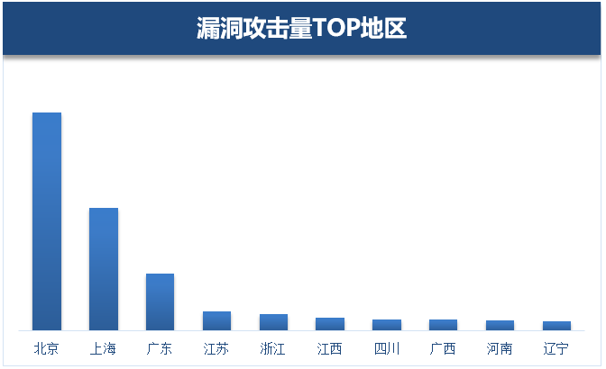 从受攻击量的对比数据看,政府、教育、医疗卫生行业因为其系统存在大量高危漏洞未及时修复,所受攻击次数也相对较高。而科技行业虽然漏洞存在量相对较少,受攻击量却是最高的,这样从另一方面说明,漏洞利用攻击者通常是有目的针对性地采取攻击,对科技行业的攻击,泄取机密往往成为首选目的。