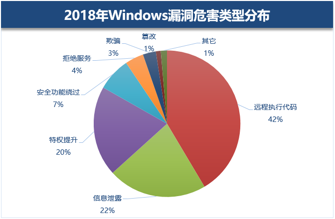 Flash高危漏洞修复率偏低是由于许多第三方软件会自带一个Flash插件,而微软官方提供的Flash补丁仅能更新其中一小部分,无法完全覆盖第三方浏览器目录下的所有Flash插件,导致部分用户电脑上的Flash漏洞较难得到彻底修复解决。 Office软件本身对更新做的是相对较弱的提示,如果没有第三方安全软件的强提醒,一般用户主动安装补丁修复Office安全漏洞的较少;另一方面,国内存在大量盗版Office用户,而这些盗版镜像往往经过镜像制作者的修改,难以正常安装补丁。对于重要的政府机构、企事业单位、科研机构来说,软件系统的正版化对降低黑客入侵风险具有十分重要的意义。 2.5 Windows漏洞危害类型分布&漏洞危害等级分布 在2018年曝光的Windows平台漏洞中,远程执行代码类漏洞达到了42%的高占比,其次是信息泄露类漏洞和特权提升类漏洞各占20%。远程执行代码类漏洞由于其兼具隐蔽性与自由度,广受黑客攻击者欢迎,今年曝出的两个IE“双杀”0day漏洞(CVE-2018-8174、CVE-2018-8373)就是被广泛利用于恶意攻击的最好例子。