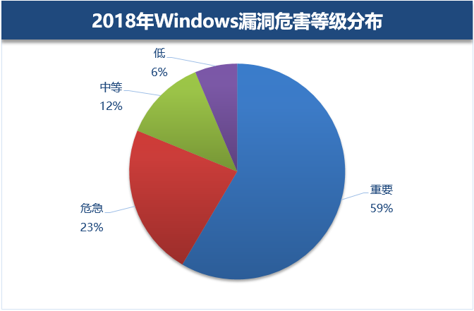 2018年曝光的Windows平台漏洞中,“危急”等级(漏洞危害最高等级)的漏洞占比23%,“危急”等级的漏洞量依然占据着较高的比例。