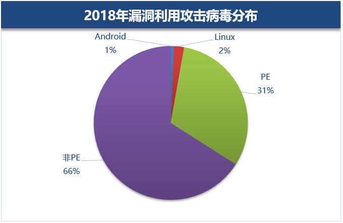 2.6 Windows漏洞利用病毒分布&被利用的漏洞分布 在2018年利用漏洞进行攻击的病毒中,非PE(文件格式)占了66%的高比例,而PE文件占了31%。常见非PE漏洞攻击病毒有Office宏类病毒、脚本类病毒。相比较PE,非PE病毒的攻击手法更灵活,对安全软件来说检测非PE病毒更为困难。