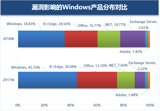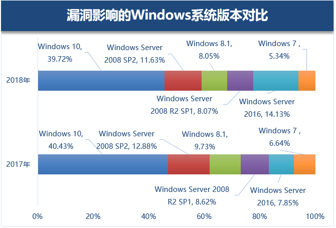 从2017年同比数据也可以看出,Windows Server 2016上报告的漏洞数增加了近7%,同时可预测,针对新版服务器操作系统的漏洞也将越来越多。