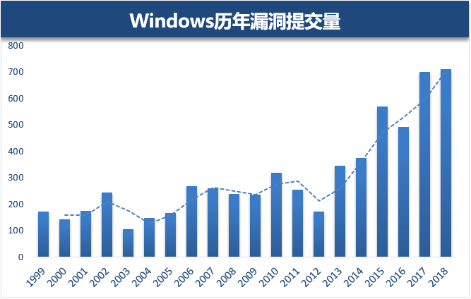 信息来源:4hou 一、前言 漏洞是影响网络安全的重要因素,而漏洞攻击作为恶意攻击的最常用手段,更是有着目标行业化、手段多样化的趋势,不论是个人还是企业,都面临着严峻的漏洞威胁。 2018年在轰动式的“幽灵”、“熔断”两大CPU漏洞中揭开序幕。“震网3漏洞利用挖矿”、“412挂马风暴”等安全事件发生表明,漏洞利用攻击,不再是APT组织的“专属”,漏洞利用正往“低成本化”趋势发展。过去一年,Windows、Office、IE、Flash等高危漏洞频繁被曝光,而各种野外漏洞利用更是攻击层出不穷,更给个人和企业的网络安全带来了严峻的威胁。本报告主要重点分析2018年Windows平台的漏洞攻击态势,并给个人和企业合理化的漏洞防护建议。 二、2018年Windows平台漏洞盘点 2018年对于安全行业是颇具考验的一年,据安全数据库网站cvedetails.com的漏洞提交数据统计,自1999年起,Windows操作系统的漏洞提交数量就呈逐年上涨的趋势,而在近几年达到了一个爆发期,今年的安全漏洞提交数相较过往三年同比上升最高超过40%,安全漏洞的数量和严重性创下历史新高。