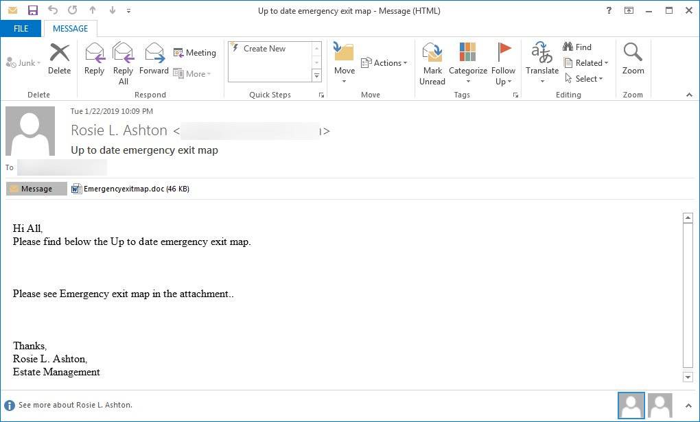 最新的垃圾邮件活动假装发送给接收者所在建筑物的紧急出口图。邮件称来自Rosie L. Ashton,主题是Up to datе еmеrgеnсy еxit map(最新紧急出口图),附件中有一个名为Emergencyexitmap.doc的word文档。