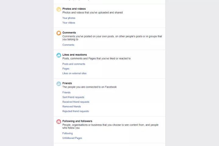 Facebook的下载包括很长的索引文件,为用户显示在哪里可以找到其所有信息