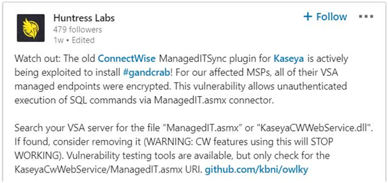 根据MSP安全公司Huntress Labs在LinkedIn中发布的帖子,勒索软件分发者正在利用此漏洞攻击MSP。