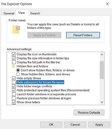 要在 10中显示文件扩展名,您可以在Cortana中搜索文件资源管理器选项,并在视图选项卡中取消选中“隐藏已知文件类型的扩展名”,如下面的屏幕截图所示。