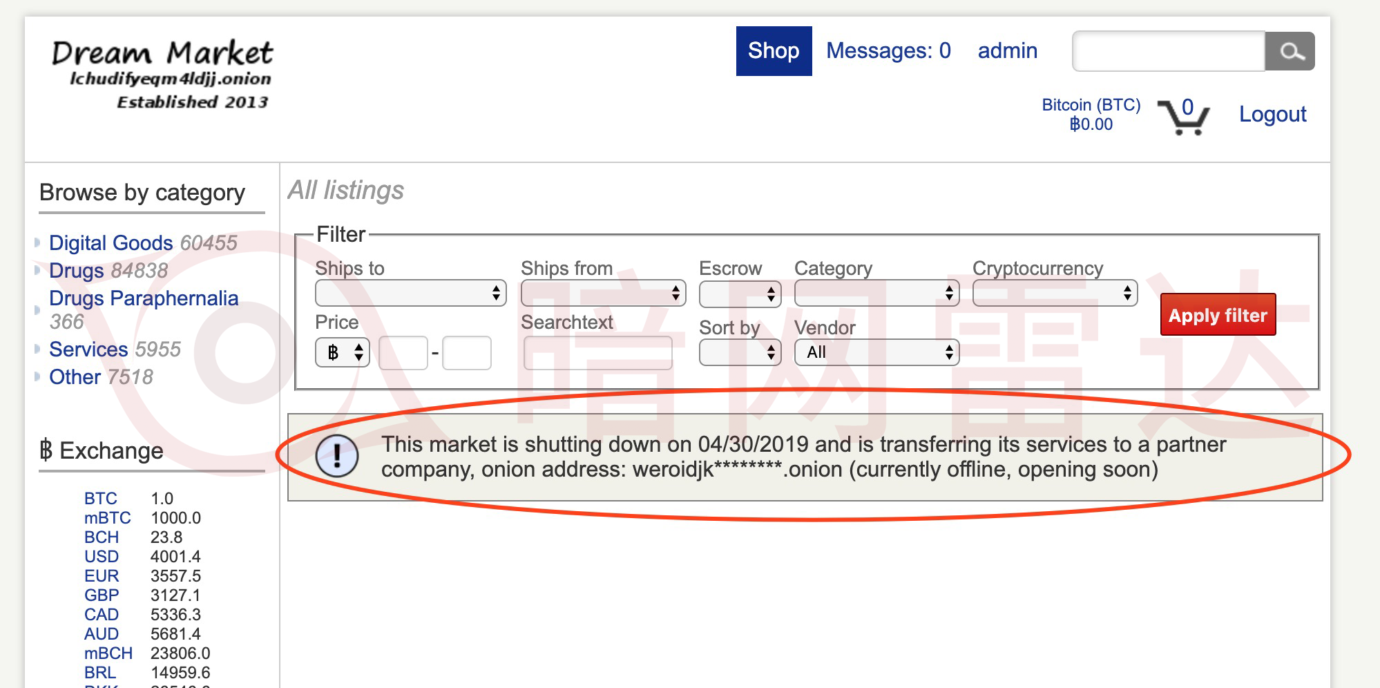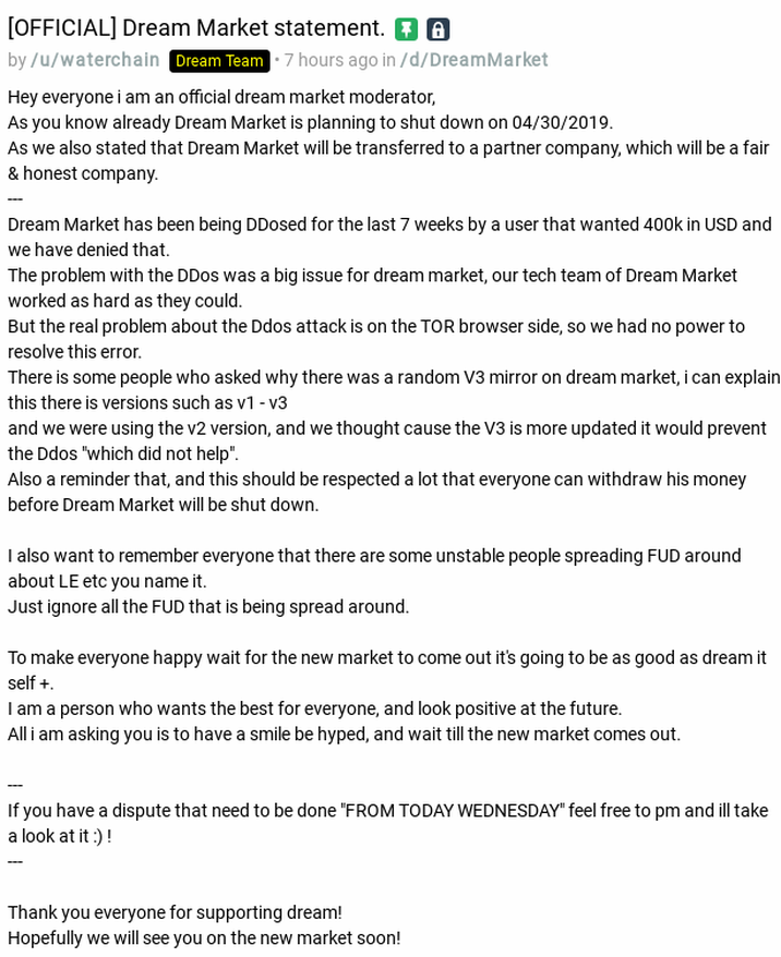 目前最大的暗网市场 Dream Market 3月26日发布声明,宣布网站将于2019年4月30日关闭。